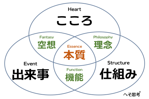 ・へそ思考とは,この単純な構造が繰り返されます。当たり前すぎて拍子抜けしたり,世の中を単純にしすぎだと猛烈に反論したりする方も結構いらっしゃいます。ただし領域に代入できる言葉は数多に存在しますし,重複しなければ領域も選びませんので,組み合わせの数は甚大です。