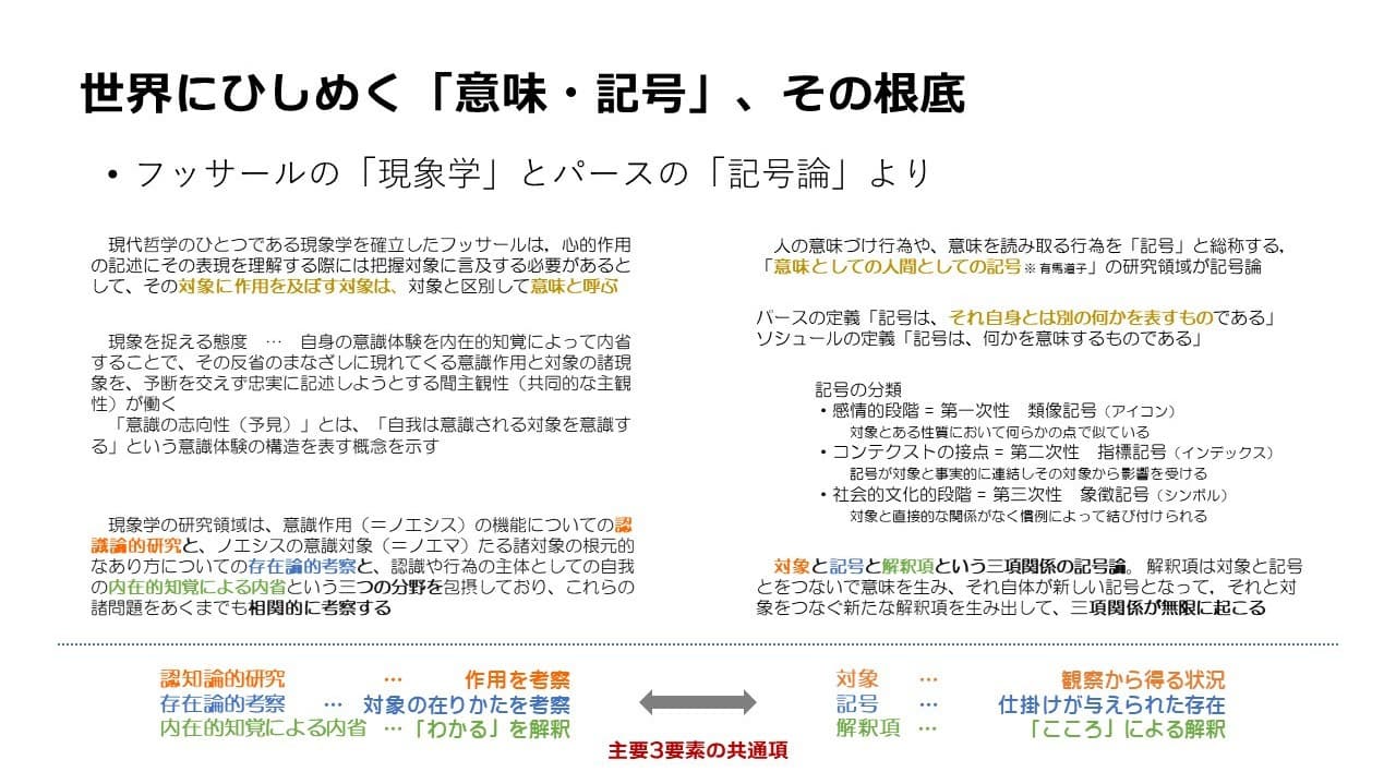 ・ここではフッサールとパースを例にしていますが,入念に練られた思想はほぼ的確に「こころ・出来事・仕組み」を組み込んでいるようです。精緻な論理ほど,この状況は顕著です。逆に言えばこの3つのどれかに偏っていたり,明確に分類できていないと説明が複雑化します。