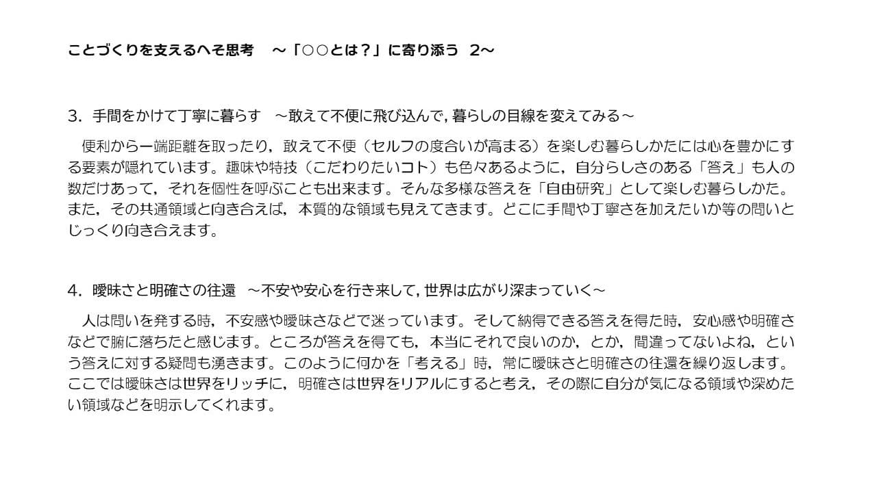 ・上記8項目の流れが,便利や高効率な暮らしかたに慣れた社会生活で置き忘れられた感覚を今一度呼び覚ますことに役立ちそうなら幸いです。