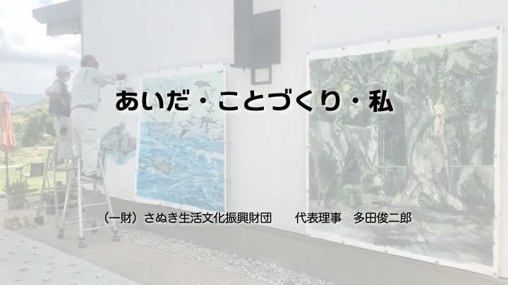 当財団の事業活動は「私はここにいる。それだけで充分に素晴らしい」が,全てのスタートでありゴールです。この主観に終始する前提を見失わずに,深く深く本質まで掘り下げようと考えたテーマが,この「あいだ」や「ことづくり」でした。これから話す内容と,皆様のご研究との「あいだ」に,何かしらの「こと」が起こせれば幸いです。しばらくおつきあいください。