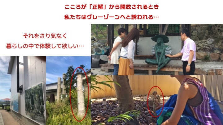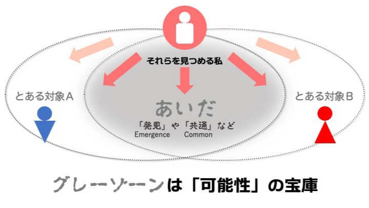 さて,多くの人は自分と社会的なしがらみなどの,広大な「あいだ」で暮らしています。また,程度の差はあってもどんな人にも「正しさ」へのこだわりがあります。実際,教育現場にいたときの私は正解を求めすぎて,息が詰まる暮らしかたになっていました。そこから開放されて,自由に,自分なりの「答え」が愉しめる場を見つけたとき「あなたはあなたのままでいいんですよ」と言われた気がしましたが,これがグレーゾーンへの新たな入り口だったようです。