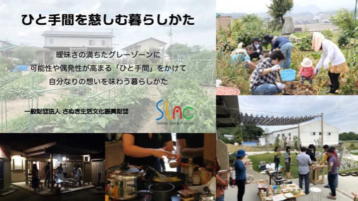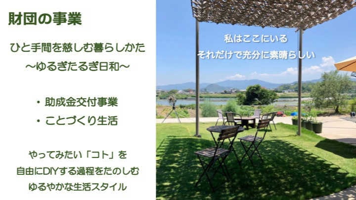 財団の事業について説明します。全体テーマは,ひと手間を慈しむ暮らしかた〜ゆるぎたるぎ日和〜 です。ゆるぎたるぎとは,香川の方言です。「ゆるやかに充足感を味わう様」といったところでしょうか。別の言い方をすれば,「グレーゾーン」をたゆたう状態です。肩肘張らずに等身大の自分と向き合い,のんびりまったり過ごす暮らしかたを提供しています。