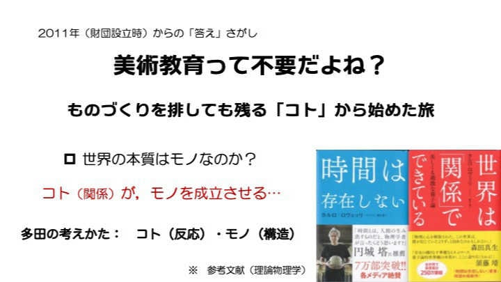 また,財団設立の前後で盛んに言われていた「美術教育不要論」に対する,自分なりの「答え」も探していました。当時の学会などでは造形表現の良さを訴える具体的な事例が溢れていましたが,私は,ものづくりで起きる「コト」を出発点にしました。当時,美術教育からかたちや色を取り除いて何が残るんだと批判されたこともありました。たとえ,視覚や聴覚を失っても人間の本質は失われません。それと同じこと,を裏付けしたかったのです。