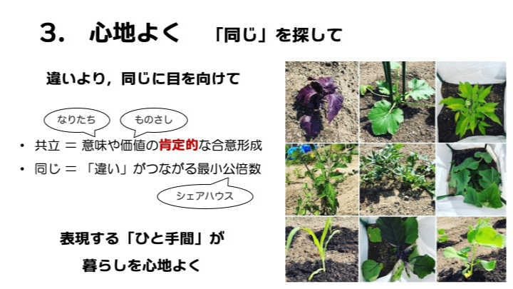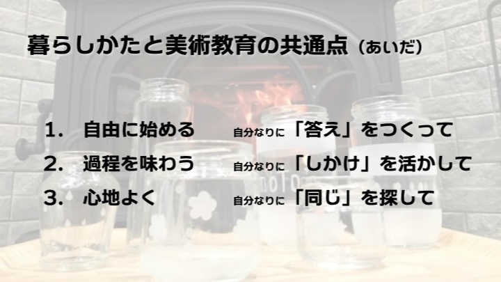 次に,私が考える暮らしかたと美術教育の「あいだ」,そこにある共通点を3つ挙げてみます。
