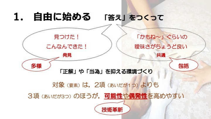 そのためには,次の項目で述べる「あいだ」をじっくり眺める時間と方法論が必要です。そこで導かれた人それぞれの「答え」は,社会においては,発見は多様へ,共通は包括へ,可能性や偶発性は技術革新へ向かうエネルギーになるようです。
