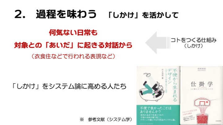 ふたつめは,過程を味わう。季節や気分で服を着こなし,映える料理に歓喜し,整えられた住まいで安らぐなどの何気ない日常。これらも必ず,自分となにかしらの対象との対話によって営まれています。きっと,自分と対象との「あいだ」に起きる「反応」が,私たちをさまざまな表現活動へといざなってくれるのでしょう。どんなにささやかな「コト」でも,気づけた自分が嬉しくなって,誰かに話したい,どこかで再現したい気持ちも高まります。これは,作品づくりで教師側がこどもたちの製作プロセスを見取る大切さにつながります。
