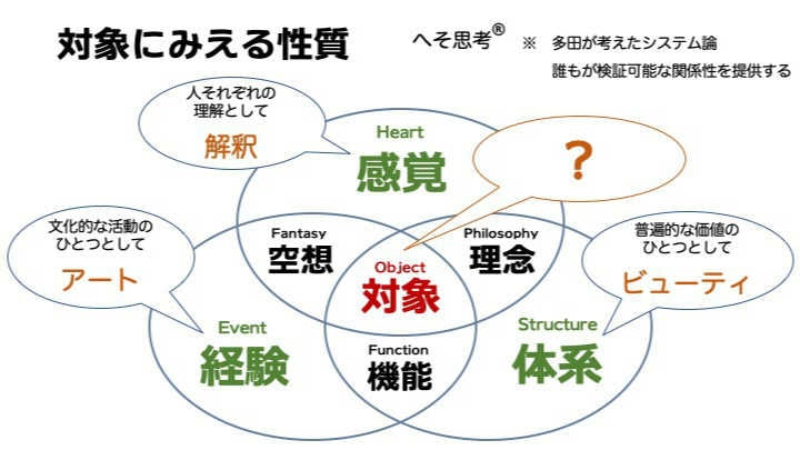 本図は,私が独自に考えた「へそ思考」と呼んでいるシステム論の一部です。これは,対象の性質を示す最小構造ですが,少々難解なので詳しい説明は省きます。このへそ思考は「グレーゾーンに道しるべを設けるしかけ」です。それでは少し例示をしましょう。〜文化的な活動のひとつとしてのアート〜 普遍的な価値のひとつとしてのビューティ〜 人それぞれの理解としての解釈〜 皆さんが気になるのはどのあたりの領域でしょうか。そして,この3つの「あいだ」にはどんな言葉があてはまりそうですか。